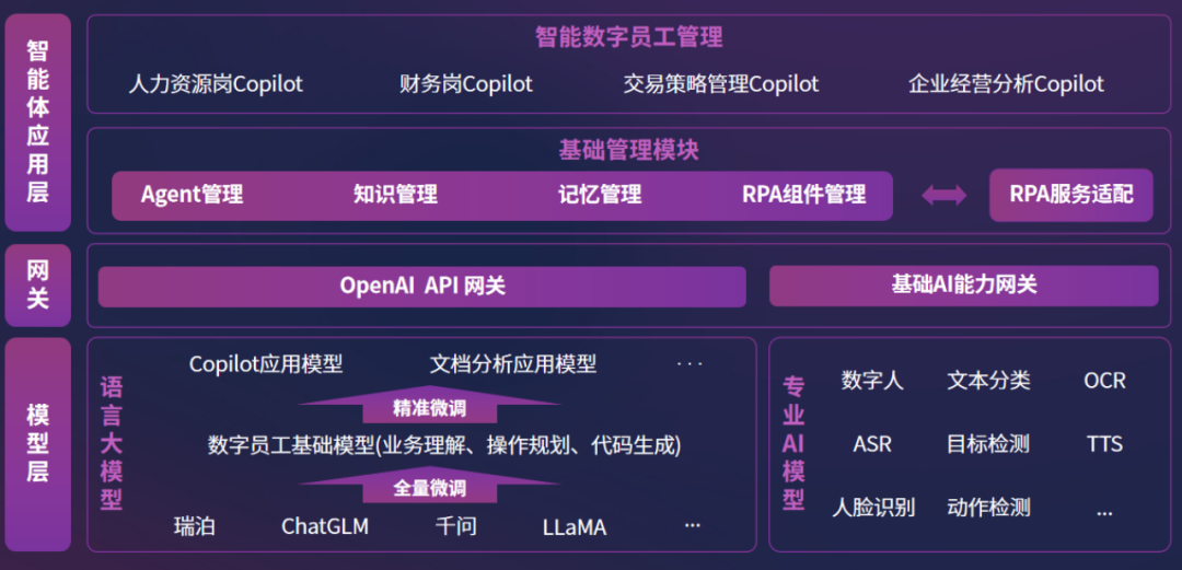 金智维将大模型与RPA融合,打造智能平台K-Agent,该平台经过精心设计和调试,集成了大模型的先进算法和RPA的灵活性,解决了传统业务流程自动化在自然语言理解与处理、自动化流程管理、文档处理、代码生成等方面的能力短板。在K-Agent平台基础上,可以依托精调的行业数字员工模型,来开发部署各种智能助手,赋能财务管理、人力资源管理、合规风控、客户服务、营销管理等各种具体的业务流程,进而构建出一个完整的企业智能助理体系。