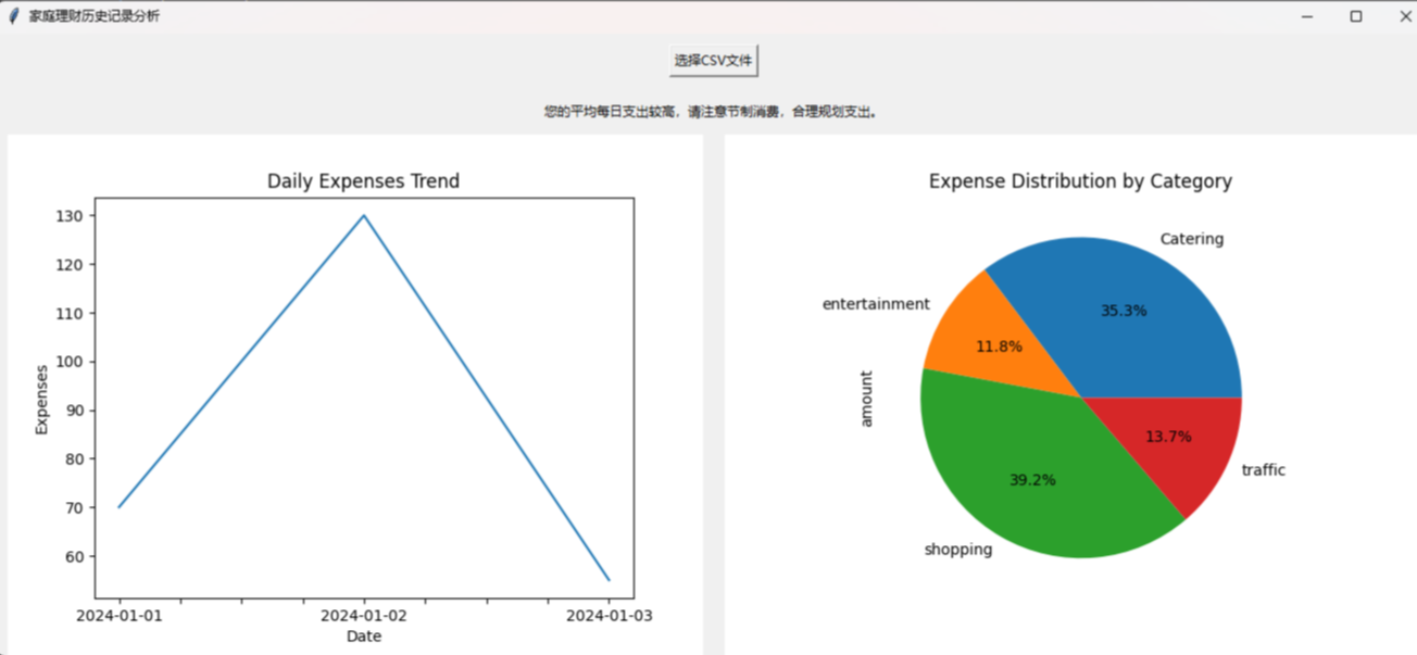 create_gui()以上代码代码将帮助您创建一个基于Python的带界面的家庭理财历史记录分析程序。用户可以通过选择CSV文件来导入家庭理财历史记录,并通过界面展示支出趋势图和支出类别占比饼图,同时根据平均每日支出给出财务建议。