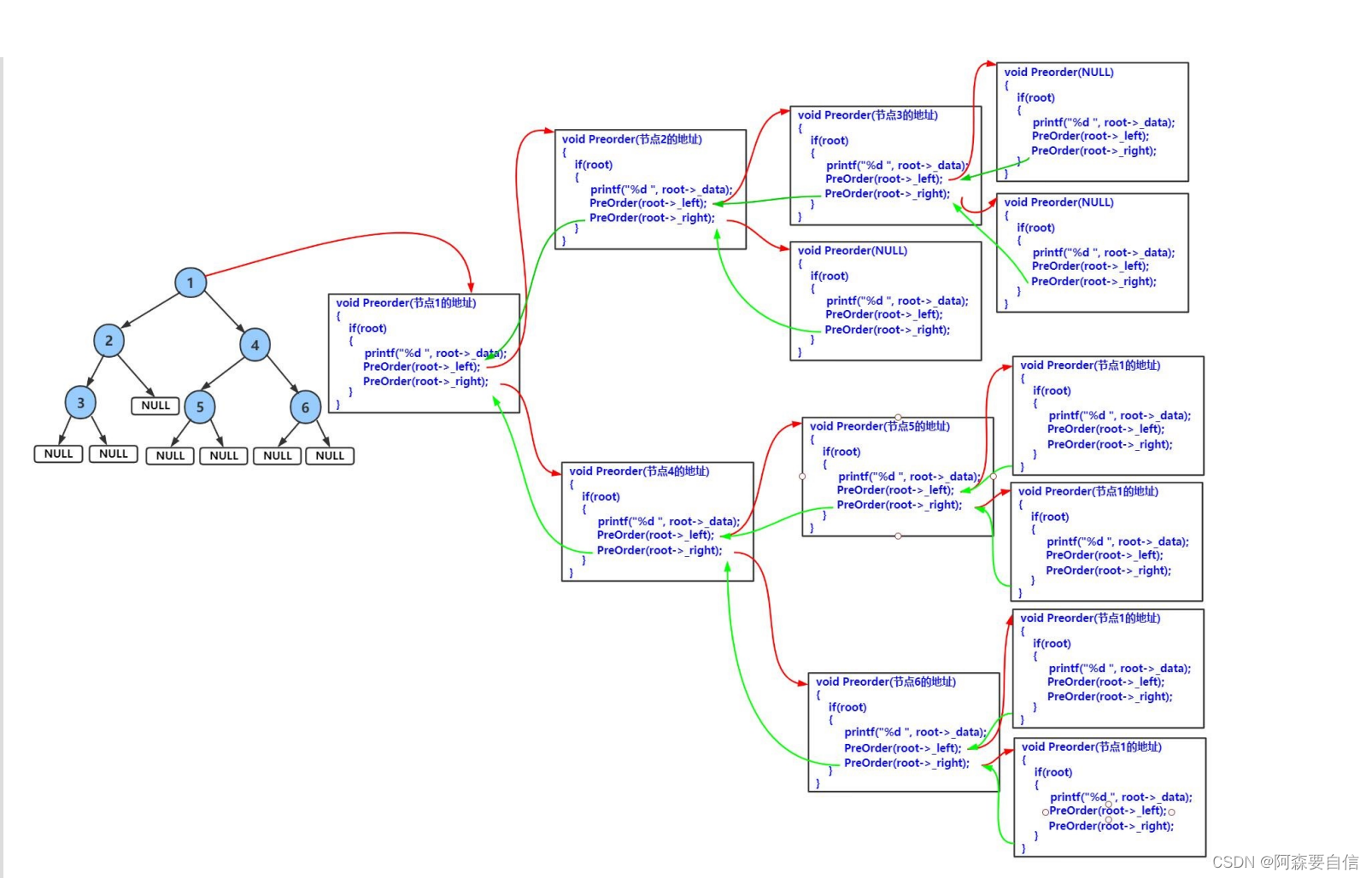 注意: 递归基准条件是当根节点为NULL时返回。访问根节点要放在递归左右子树之前,这保证了根节点一定先于其子节点被访问。递归左子树和右子树的顺序不能调换,否则就不是前序遍历了。
