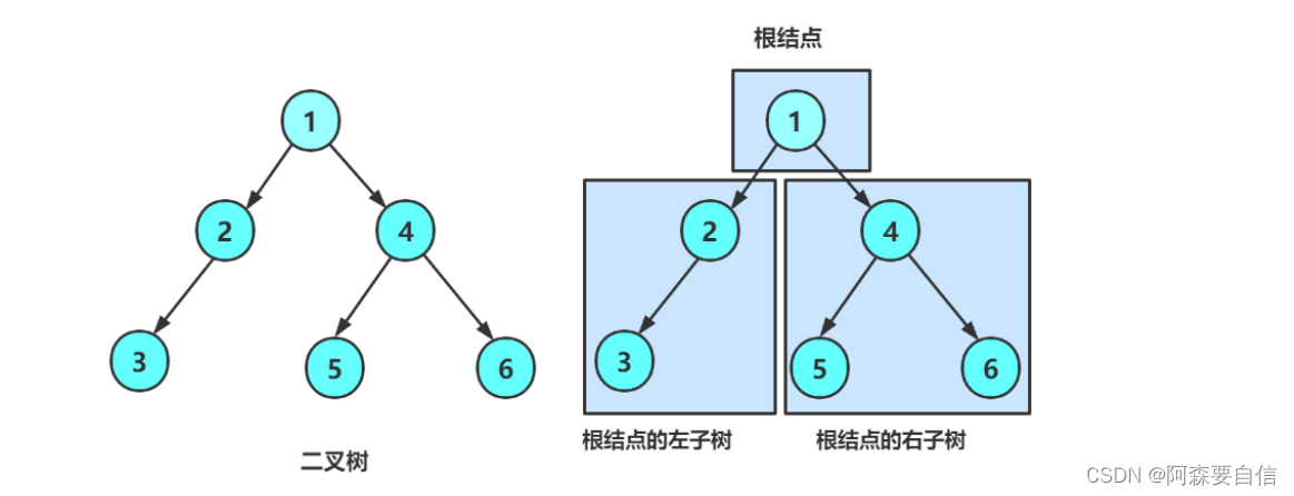 二叉树可以没有节点(空树)否则,它包含一个根节点,这个根节点最多可以有两个分支:左子树和右子树,左右子树也符合二叉树的定义,可以是空树,或者由根节点和其左右子树组成。 因此二叉树的定义采用的是递归的思想:一个二叉树要么为空,要么由根节点和其左右两个子二叉树组成。左右子树本身也符合二叉树的定义,可以递归定义下去。