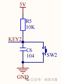 在开发板的电路图上,有 KEY1 和 KEY2 两个图,它们的电路是相同的,如下图所示。