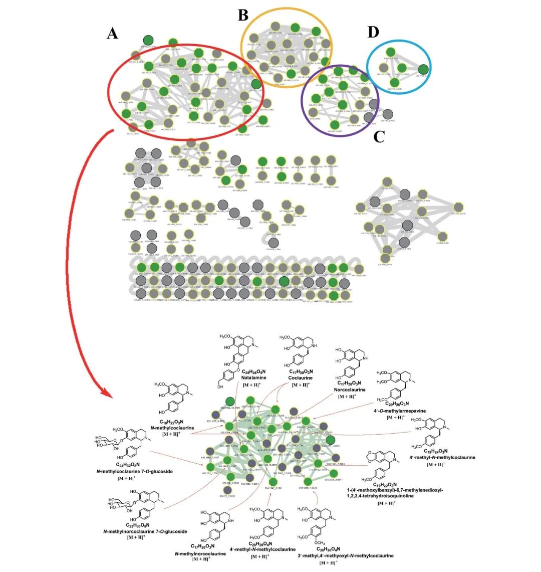 基于实验性 MS/MS 光谱数据库,该研究最初对分子网络中的单个节点进行化学分类,从而在分子网络中迅速识别出特定的化合物簇,以探索新的异喹啉类似物。在查看了分子网络中每个特征映射的化学分类结果后,研究人员发现,很容易就能找到与异喹啉类似物相对应的某些化合物簇,同时,异喹啉类化合物主要分布在分子网络中的四个簇中。