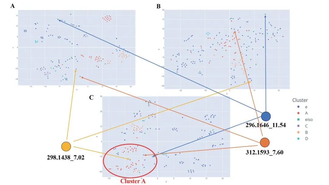 但基于 MS2DeepScore,异喹啉的大簇 A 和 B 的节点间隔很近,形成了几个聚类区域,但大簇 C 中的节点分散在了整张图中,这为后续分析带来了挑战。