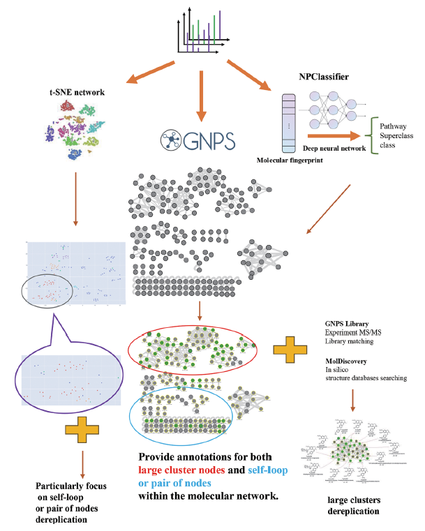 IMN4NPD 的核心工作原理是由光谱相似度驱动的分子网络。它通过集成并协同 NPClassifier, molDiscovery 和 t-SNE 网络等多种计算工具,从而帮助研究人员快速识别特定类别的化合物,同时还能简化分子网络节点中的标注。 * NPClassifier:一种基于深度神经网络的天然产物结构分类工具 * molDiscovery:一种质谱数据库搜索方法