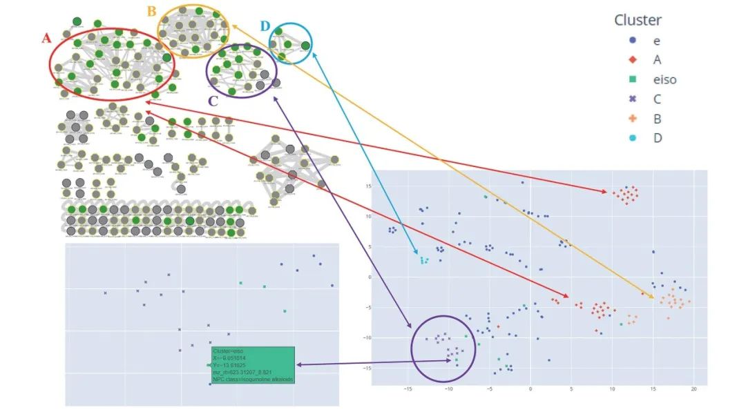 在传统的分子网络观点中,异喹啉一般由三个大簇 (簇 A-C) 和一个小簇 (簇 D) 共同组成。从 t-SNE 网络的角度来看,很明显,异喹啉的四个集群节点被紧密分组,形成了不同的集群区域。但值得注意的是,从 t-SNE 网络的角度来看,分子网络中的簇 A 可以进一步分为两个更小的簇。此外,t-SNE 可以有效定位异喹啉类节点,从而大大减轻了相关节点的结构解析工作。