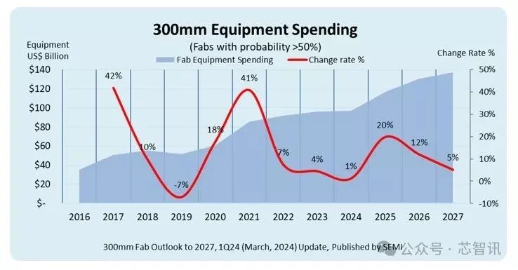 SEMI预估,全球12英寸晶圆厂设备投资预计将在2025年成长20%至1,165亿美元,2026年将成长12%至1,305亿美元,还将在2027年创下历史新高。