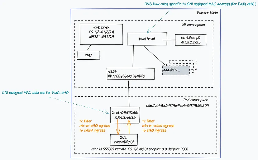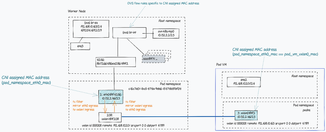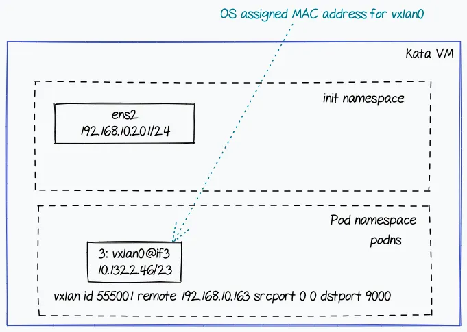 这是通过在网络命名空间中设置Linux流量控制(TC)在eth0和vxlan1之间镜像流量来实现的。这是从Kata容器的设计中已知的。然而,我认为在故障排除网络问题时检查TC配置是一种好的实践。
