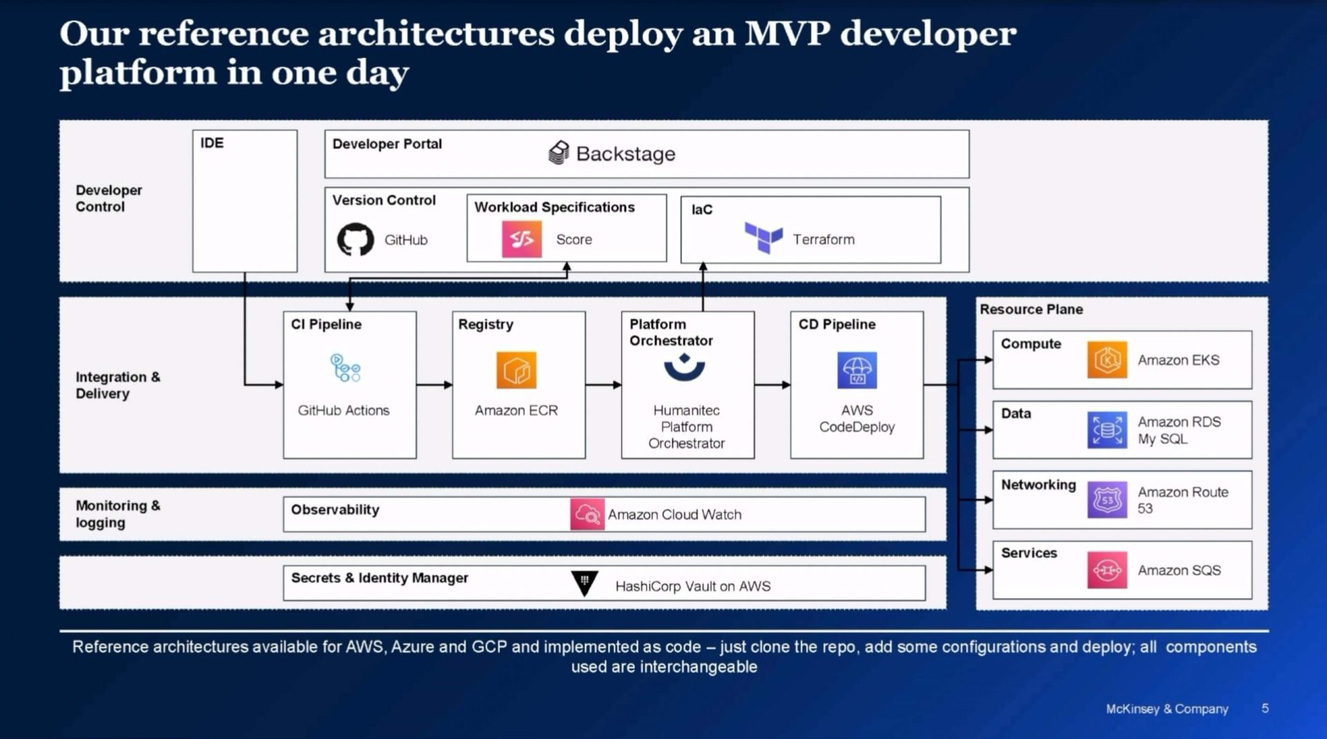 Humanitec 团队根据麦肯锡的 AWS、Azure 和 GCP 设置的参考架构,创建了更详尽的指南。这些白皮书解释了如何集成架构层面,提供了具体的黄金路径示例,深入探讨了开发者、运维和平台工程师如何从这种设计中受益等等。
