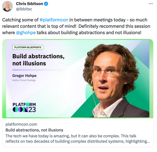 确定平台适当的抽象层级一直是非常困难的。在他的演讲《构建抽象,而不是幻想》中, Cloud Strategy 的作者 Gregor Hohpe 借鉴了二十年的分布式系统构建经验,解释了为什么隐藏更多的复杂性并不总是对开发者有用。
