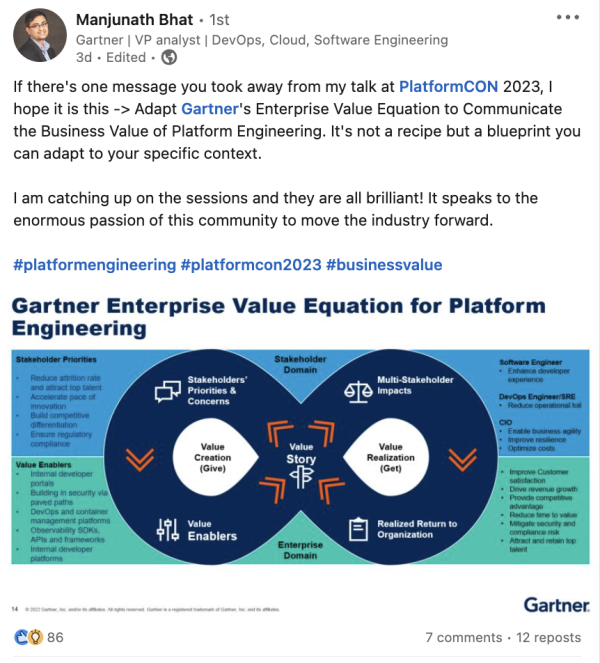 为此,Bhat 分享了 Gartner 的企业价值方程式,并展示了如何在平台工程的背景下运用该方程式。