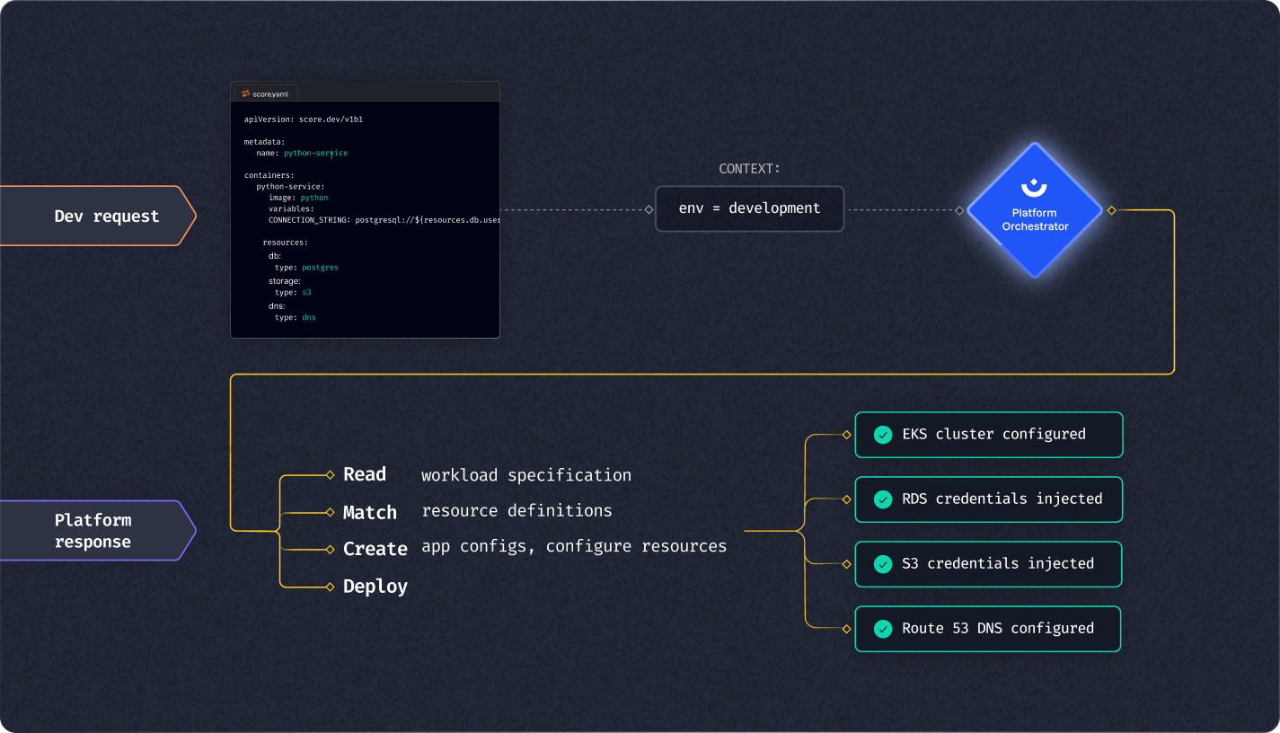 Von Grünberg 提供了一个使用 Score 和 Humanitec Platform Orchestrator 实施的部署工作负载到开发环境的黄金路径示例。黄金路径的流程如上图所示。根据 Von Grünberg 的说法,可扩展和可持续的黄金路径推动了配置和基础设施管理的标准化。在这个框架内,组织将每个发布视为 Day Zero 或“整理”和减少技术债务的机会。