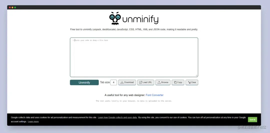 Unminify 是一个免费的在线工具,可以帮助用户将压缩的 JavaScript、CSS 和 HTML 代码还原为易于阅读和理解的格式。它提供了一个简单的界面,让用户可以将压缩的代码粘贴到输入框中,然后点击“Unminify”按钮即可还原代码。Unminify 还支持多种代码格式,例如单行、多行、混淆等等,可以自动识别并还原代码。最终生成的代码可以直接复制到编辑器中使用,非常方便。Unminify 还提供了一些高级选项,例如调整缩进、删除注释、格式化代码等等,以便更好地控制代码效果。