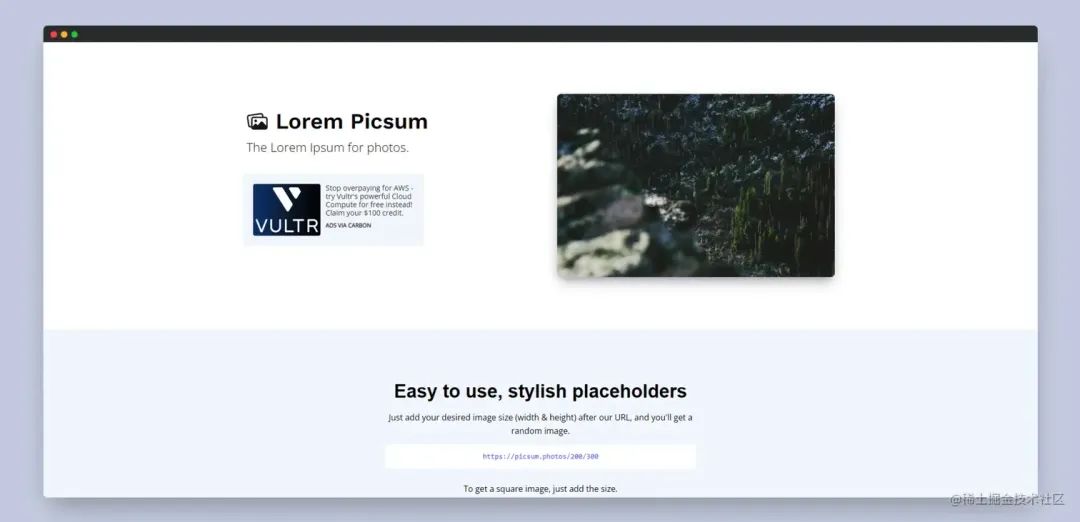Lorem Picsum 是一个免费的图片占位符服务,可以用于网站、应用程序或任何需要占位符图片的地方。它提供了一个简单的 API,可以通过 HTTP 请求获取随机图片,也可以指定特定的图片大小和其他参数。Lorem Picsum 还提供了一个网站,可以在其中浏览和下载图片。这些图片都是由 Unsplash 社区的摄影师上传的,可以免费用于个人和商业用途。