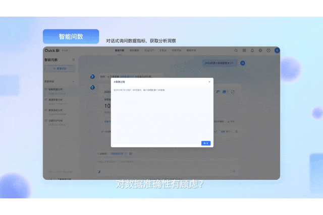 在这一背景下,Quick BI通过其智能问数功能,为这一传统流程带来了新的解决方案。这一功能的核心亮点在于其能够理解自然语言查询,极大地降低了用户与数据交互的复杂度,使得非技术背景的业务人员也能轻松进行数据查询和分析。
