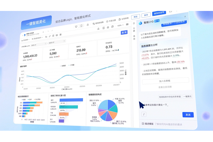 通过大模型提供的强大的自然语言理解能力,Quick BI能精准理解用户的需求,自动完成数据的提取和报表的生成,还可以通过人机对话的方式来修改分析图表的字段、名称,修改统计方式、排序,微调分析内容等,极大地减少了手动操作的繁琐程度。此外,系统的辅助分析功能,比如设置条件格式、画辅助线、求最值等,还能在报表搭建过程中提供数据洞察,帮助用户更快地得到有价值的信息。样式美化和添加查询等功能的集成,使得报表不仅内容丰富,形式上也更加多样化和个性化,满足了不同场景下的展示需求。