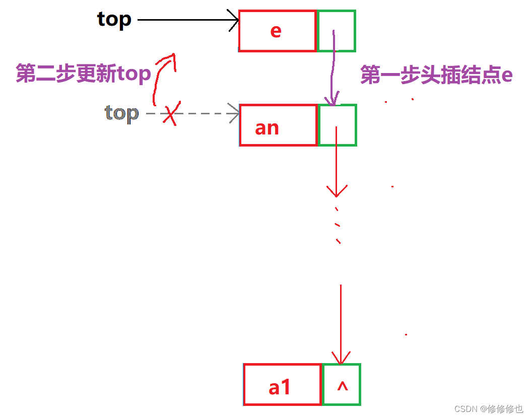 对于链栈的进栈push操作,假设元素新结点是e,top为栈顶指针,则进栈示意图如下:
