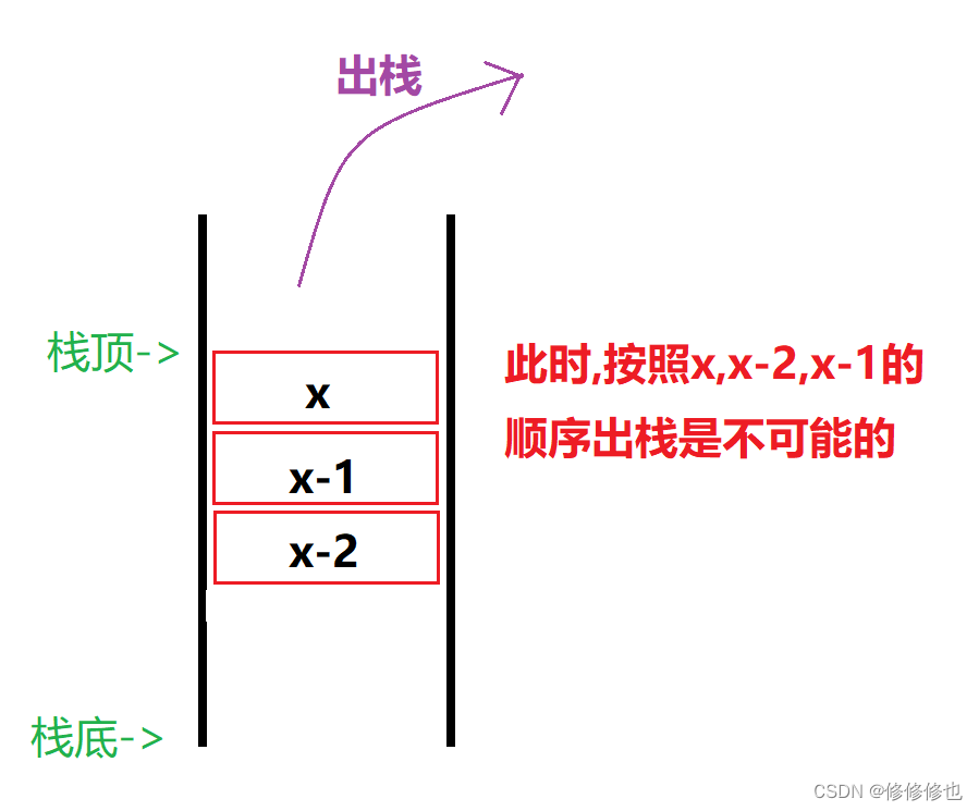 即当按照由1~x的元素顺序入栈时,假设当前栈顶元素为x,则该栈不可能实现按照x,x-2,x-1的顺序出栈.如下图: