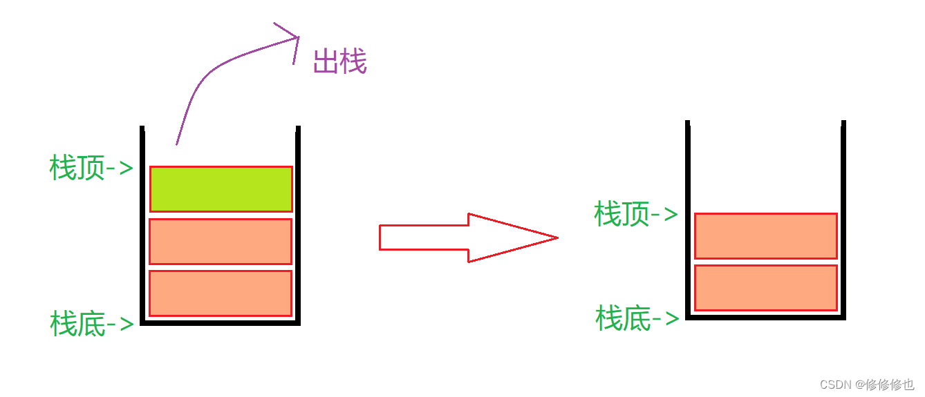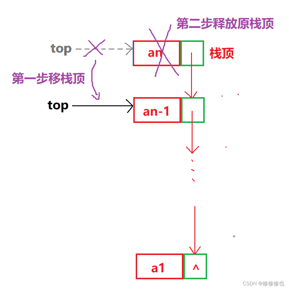 对于链栈的出栈pop操作,假设top为栈顶指针,则出栈示意图如下: