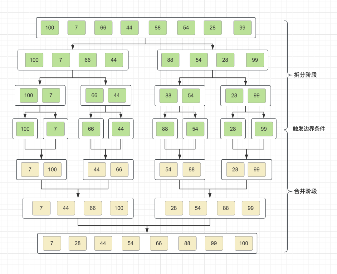 如果数组的长度最终变为 1 了,那么我们的拆分就表示已经结束。
