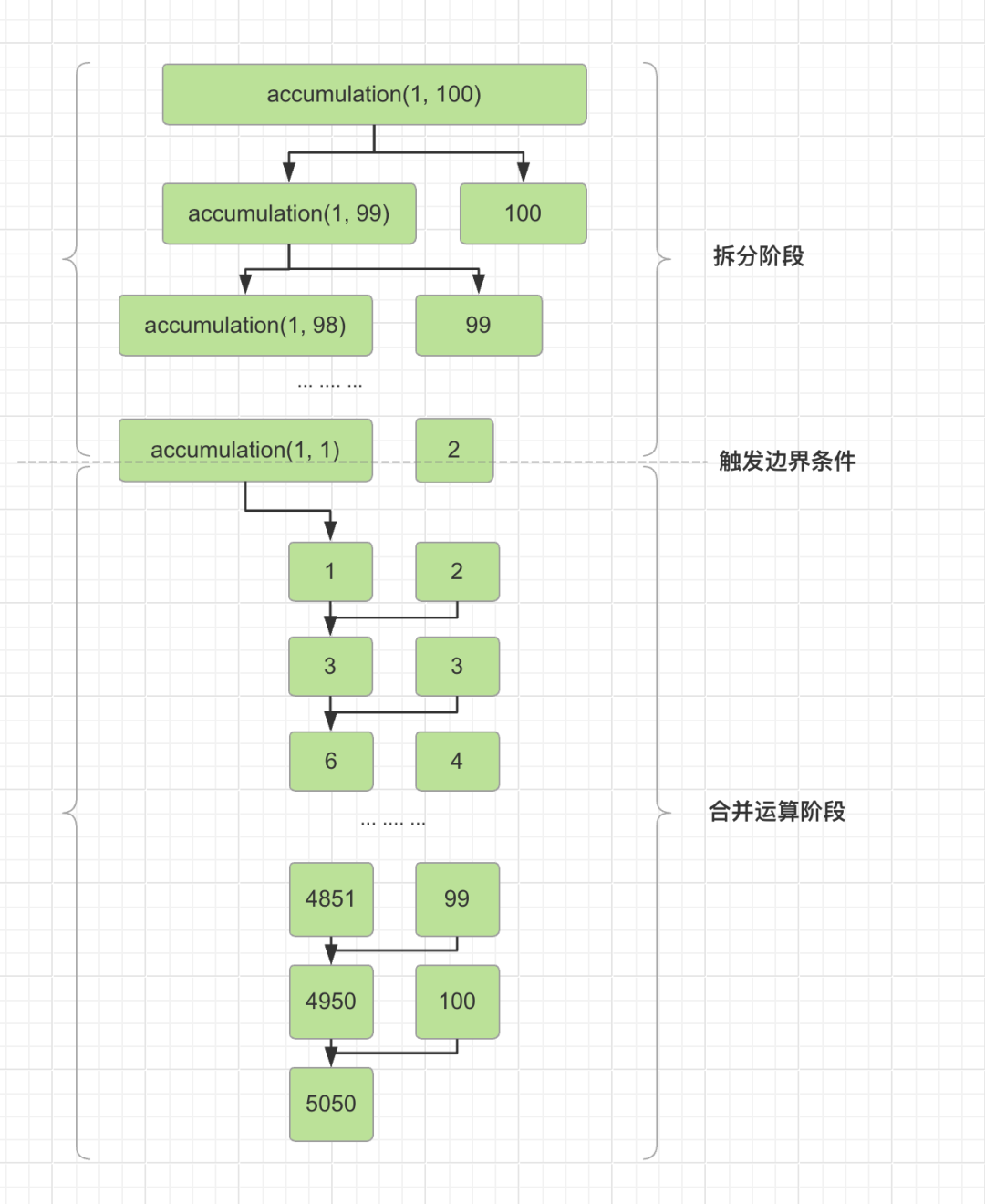 下面展示了该案例中,当我们调用 accumulation(1, 100) 时的真实运算过程。他与我们在思维上做拆解的过程是反过来的。