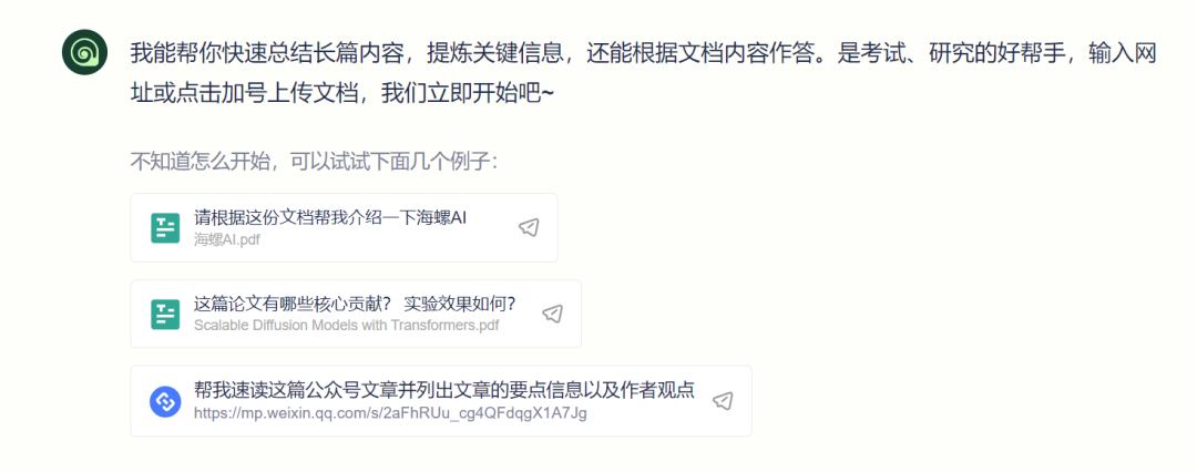 从介绍上看,"海螺AI"的长文速读能力包括快速提炼论文、财报、纪要、书籍要件的关键信息和归纳总结,还能迅速总结微信公众号文章的要点信息和作者观点。不会(或者懒得)写任何提示也没问题,找到引导案例,上传文档就行。