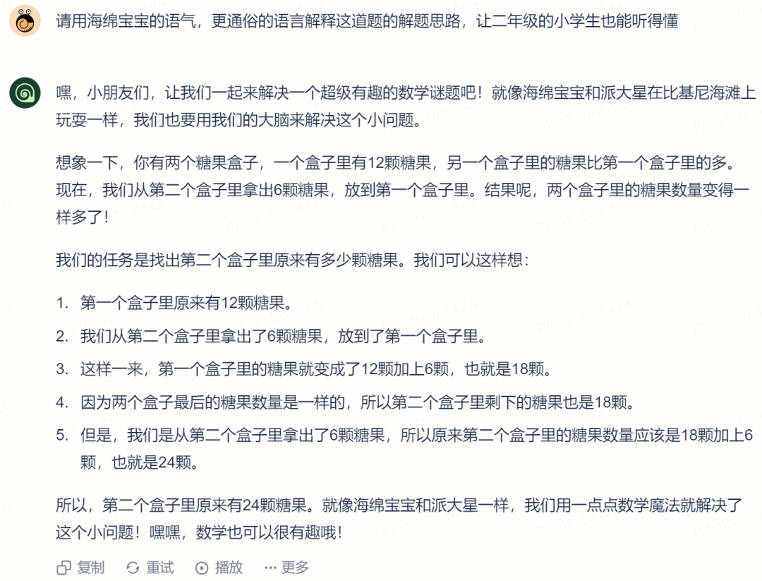 低年级学生肯定看不懂,我们要求它用卡通人物的口吻、提供更适合低年级学生的解题思路,效果还不错: