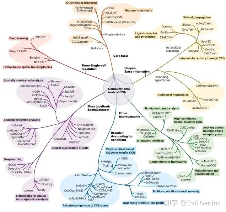 细胞空间背景化:查每个细胞空间背景的新 CCIs工具将更清晰地解读复杂组织中具有生物意义的通讯,如Giotto、Squidpy、SVCA 、SpaOTsc、COMMOT、stMLnet、DeepLinc、Neighbour-seq、CSOmap等。