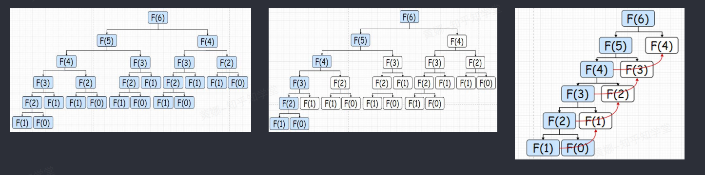 左下图是使用递归来求解的写法,显然,这是一个非常低效的方法,因为其中有大量的重复计算。并且不满足动态规划的第二个特点:“所有的子问题都只需要解决一次“,这个问题很好解决,我们只需要利用动态规划的第三个特点:”储存子问题的解“就可以了。比如,如果已经计算过Fibonacci(3),那么把结果储存起来,其他地方碰到需要求Fibonacci(3)的时候,就不需要计算,直接调用结果就行。这样做之后,蓝色表示需要进行计算的,白色表示可以直接从存储中取得结果的:
