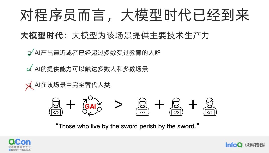 对于程序员来说,我们正处于不同的时代轮换中。在大模型时代到来时,它应该成为主要的生产力。就像马车时代马的重要性一样,在汽车时代汽车成为主要生产力,在大模型时代,大模型就是为该场景提供主要生产力。这意味着,并不是说大模型要取代所有人,而是如果一个人加上一个模型就比三个人快,那就已经很好了。就像汽车和马车一样,马在当时也是非常重要的生产力。我还记得之前举过的例子,直到现代社会发明蒸汽机之前,马一直具有很高的价值。在不同的社会中,马的价值是人的价值的三倍。如果某样东西的价值是你的两倍,那么它必然会取代你。这是一个非常有意义的观点。