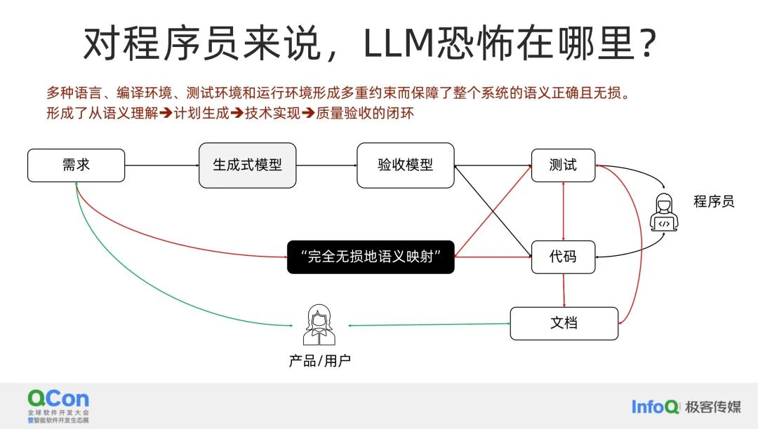 如果你有一个从需求到代码,再到测试的映射过程,并且这些过程都能够进行自洽性验证,那么你可以在多种语言、不同的编译环境、测试环境和运营环境中形成多次约束,确保整个语义系统的正确性。这就是我们所说的闭环,而这个闭环在我们的领域是第一个形成的,它是一个非常强的语义闭环。因为它所施加的约束是严格的:代码要么无法运行,要么运行结果与预期验证结果不一致,这些都是容易出现的错误。在大模型出现之前,我们已经能够进行许多自动化测试,包括半自动化和半智能的测试。而大模型的出现使得测试过程变得更加迅速。拥有了这种能力之后,我们需要重新审视程序员的价值所在。如果产品和用户能够利用生成的文档来完全验证开发过程,那么在许多情况下,程序员的角色可能变得多余。