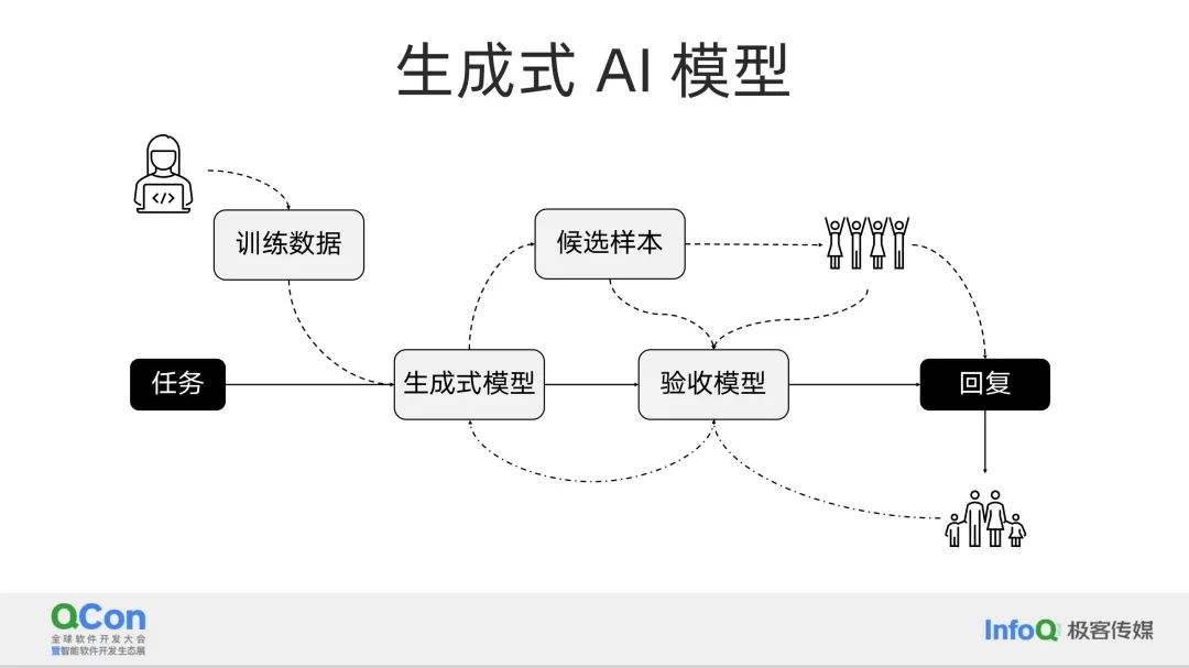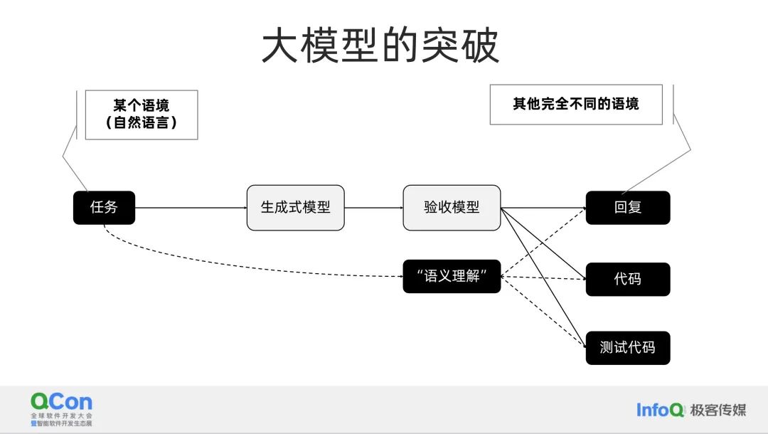 事实上,我在一年前就已经在网易的一次演讲中提到了这些观点。我认为这个逻辑非常强大,它解释了为什么大模型对我们程序员或者说我们这个行业的冲击是最大的。大模型的冲击并不在于我们现在讨论的各种应用,而是在于它改变了传统软件开发中的角色。在传统软件中,生成式模型和验收模型都是由程序员和测试人员来完成的。但现在,生成式模型和验收模型都变成了机器模型,这就改变了程序员的位置。