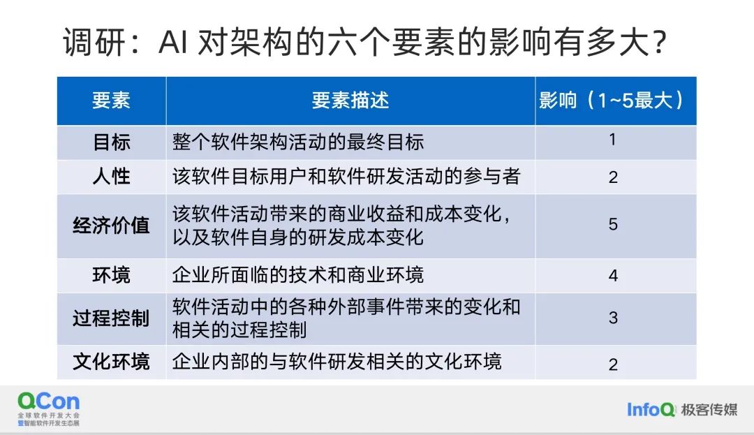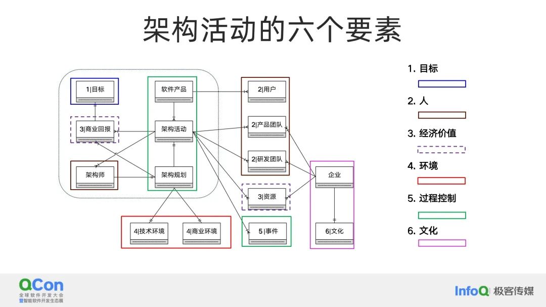 当我们进一步审视这个问题时,我们可以思考 AI,特别是大模型,对这些架构要素的影响程度。在这些架构要素中,哪一个会受到最大的影响?在进行大规模的架构活动,比如重构时,我们必须为这个活动设定一个明确的目标。这个目标定义了我们努力的方向和期望达成的成果。我们需要明确这个目标是什么,并考虑如何衡量成功与否。