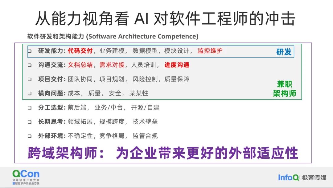 从能力的角度来看,大模型对传统架构师的影响是客观存在的。我之前已经分享过相关的幻灯片,今天我们再次审视这个问题,即大模型的到来到底对哪些方面产生了冲击。其中,红色标记的部分显示,代码交付这一环节受到的冲击最为严重,这种冲击不仅限于未来,而是已经从现在就开始了。