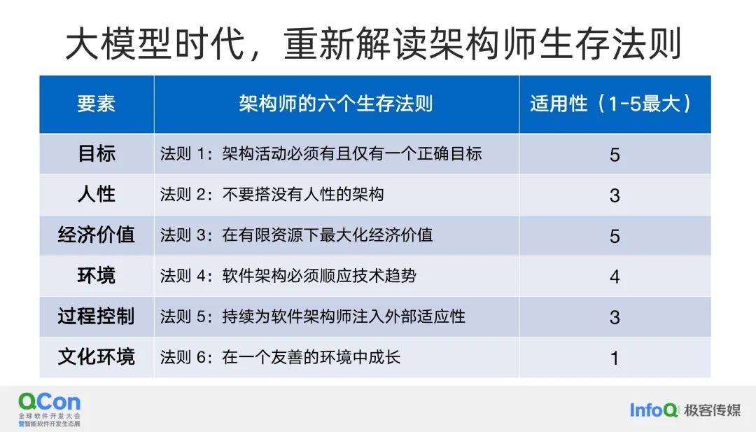 作为架构师,我们需要思考在这个时代中如何定位自己的工作。我们需要继续遵循那些在大模型时代之前总结的生存法则,这些法则至今仍然基本正确。例如,架构活动必须有一个正确的目标,这是任何架构师工作的基础。同时,我们也需要考虑到构建没有人性考量的架构可能会面临的挑战。在大模型时代,架构师的角色和职责可能会发生变化,但他们的核心价值和重要性仍然不变。在有限的资源下最大化经济价值的重要性。虽然不敢说 100% 肯定,但我对此有很高的信心。毕竟,企业需要盈利和承担支出,我们的目标始终是最大化企业的经济价值。此外,软件架构必须适应环境的需求,这一点不会因为大模型的出现而改变。