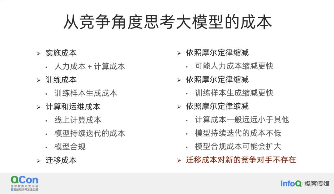 如果我们作为架构师要考虑投入大模型的决策,我们必须考虑到实施成本、训练成本、计算运维成本以及迁移成本等所有相关成本。在我看来,多数企业应该考虑在大模型上进行投入,因为这些成本随着时间的推移,按照摩尔定律逐渐降低。特别是训练样本的生成成本,由于在许多场景中可以与其他大模型共享,因此训练样本的成本也有可能大幅降低。