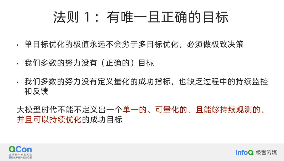 接下来,我想强调的是设定唯一且正确的目标,这是架构师生存法则的第一步。在大模型时代,这一点变得更加重要。我给它打了 5 分,表明其重要性。在大模型时代,目标的精确性至关重要。一旦更改目标,就会产生后验成本。大模型的开发涉及大量的训练成本,尤其是生成大量训练数据的成本,这可能非常高昂,有时甚至超过训练本身的成本。在启动大模型项目之前,必须明确你想要解决的问题和目标,清晰定义目标,并确定衡量成功与否的指标。对这些问题的深入思考和明确定义是架构师最大的贡献。