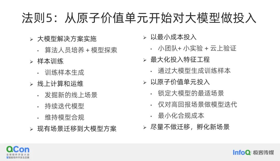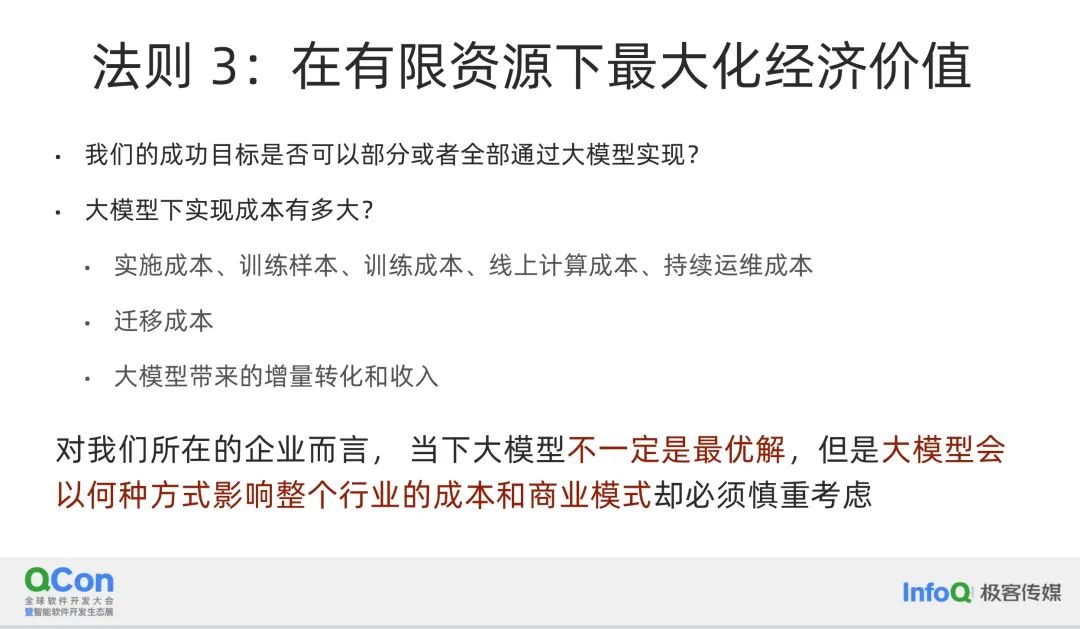 法则 3 是在在有限资源下最大化经济价值。在大模型的开发和应用中,成本是一个不可忽视的重要因素。首先,定义目标是至关重要的第一步,因为在大模型的尝试中,成本是非常高昂的。大模型不仅在实施阶段成本不菲,而且在训练样本的准备上也需要大量的投入。此外,训练过程本身的成本也不低。除了训练成本,线上计算成本,也就是进行推理的成本,也会因公司和应用场景的不同而有所差异,但通常来说这也是一个不小的开支。持续运维的成本同样不可小觑,因为随着场景的变化,模型可能会逐渐失效,需要重新训练。在某些情况下,这种情况可能会好一些,但成本仍然是一个需要考虑的因素。