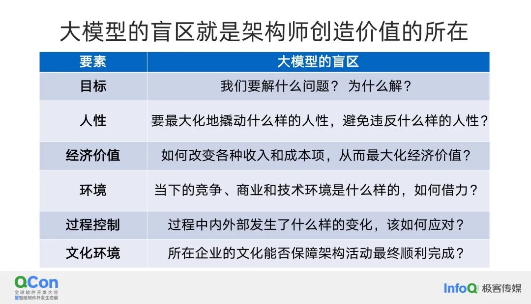 大模型的盲区就是架构师创造价值的所在。 实际上,关于我在《架构思维,从程序员到 CTO》这本书中提到的每一个架构要素,大模型都无法回答。第一个要素是大模型不知道你要解决什么问题。比如你要开发一个操作系统或做一个 AI 代理,你要解决什么问题是别人无法知晓的,作为架构师必须清楚地知道你的商业目标是什么。同样,人性方面,大模型的引入会改变某些人性机制。我们本来具有怎样的人性?现在突然引入大模型,会影响我们的人性。尽管大模型本身可能不具备人性,但是它的引入会给企业软件开发带来人性挑战。开发人员会怎么想?用户会怎么想?用户可能并不关心软件是由程序员编写还是由大模型生成的,但是企业人员可能会关心。经济价值会发生何种变化?收入和成本会发生巨大变化,因为作为架构师,你组织的架构活动中最大的成本是人力和时间。有了大模型,这两个成本都会发生巨大变化。你应该如何应对这些变化?还有环境和各种过程,我就不一一赘述了,但这些都是大模型无法回答的问题,因为大模型不了解你的工厂、你的企业,或者你的架构活动需要处理什么事情。因此,作为架构师,我们有机会为整个企业注入最佳的相关决策。