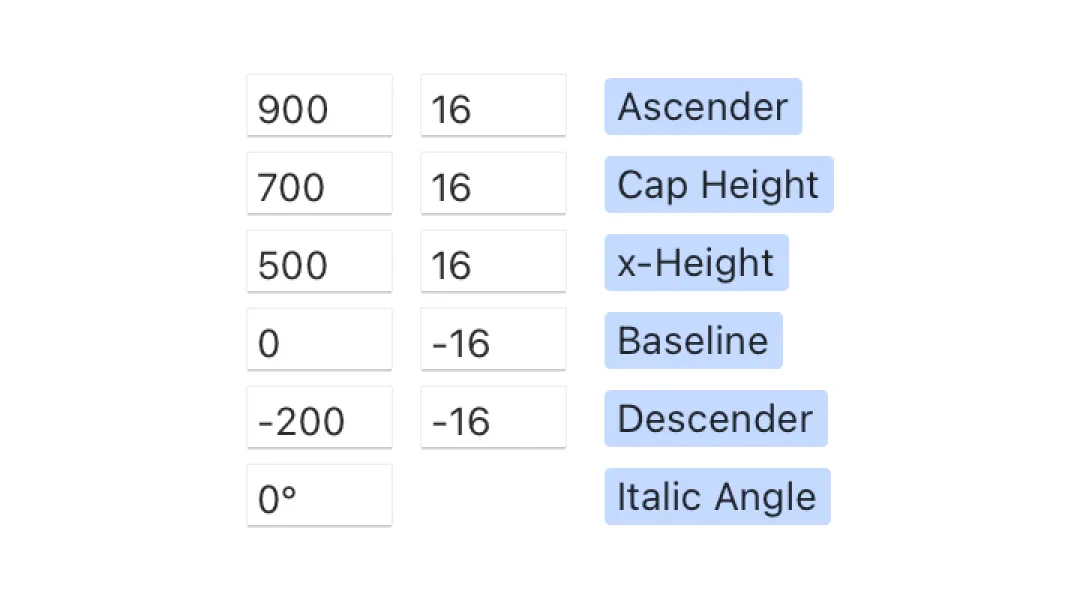 查看字体参数,请点击这里(ascender、descender、sCapHeight)。