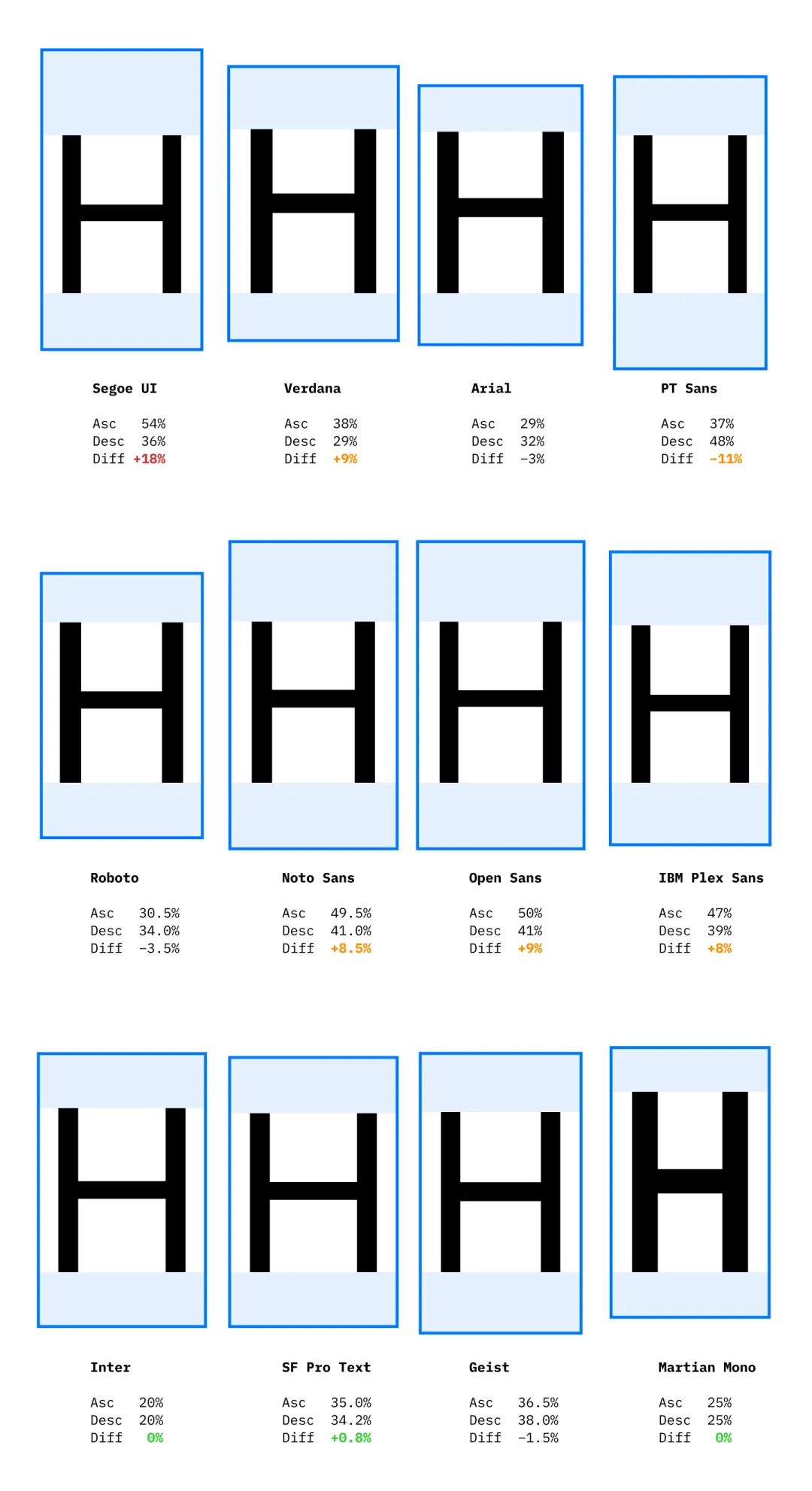 无论是 Web 开发还是原生开发,为了避免麻烦,务必选择遵循此规则的字体。SF Pro Text、Inter 和 Martian Mono 似乎都已经做到了这一点,所以使用它们不需要额外做什么工作就可以实现完美居中。