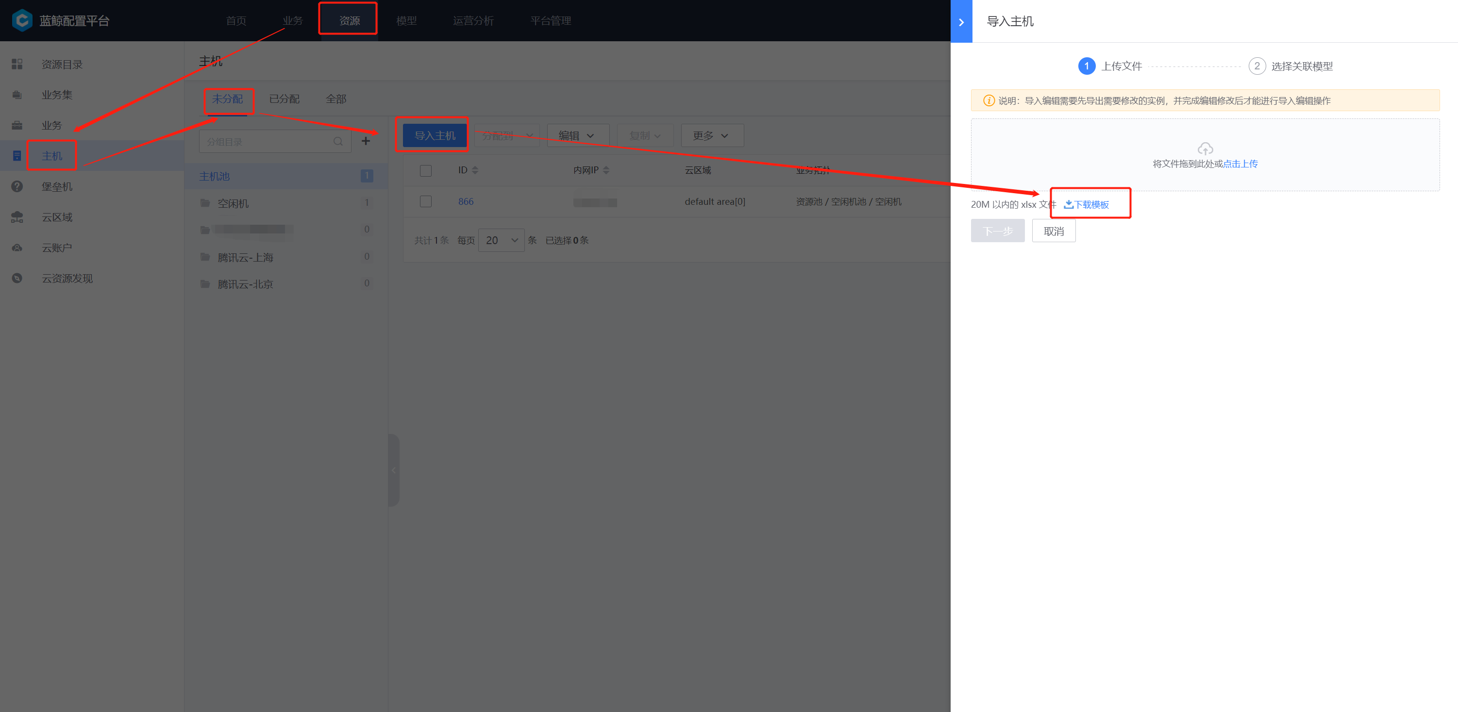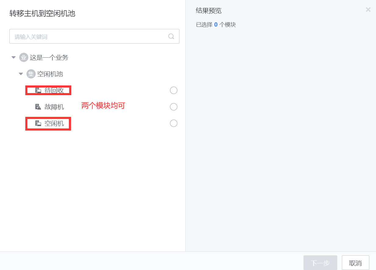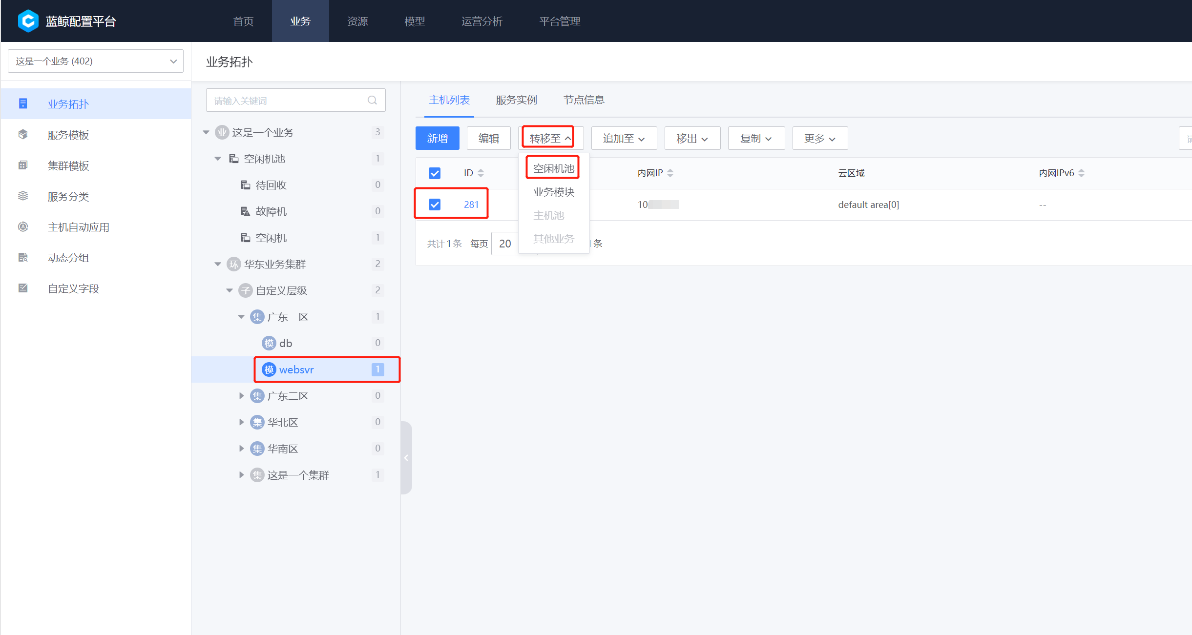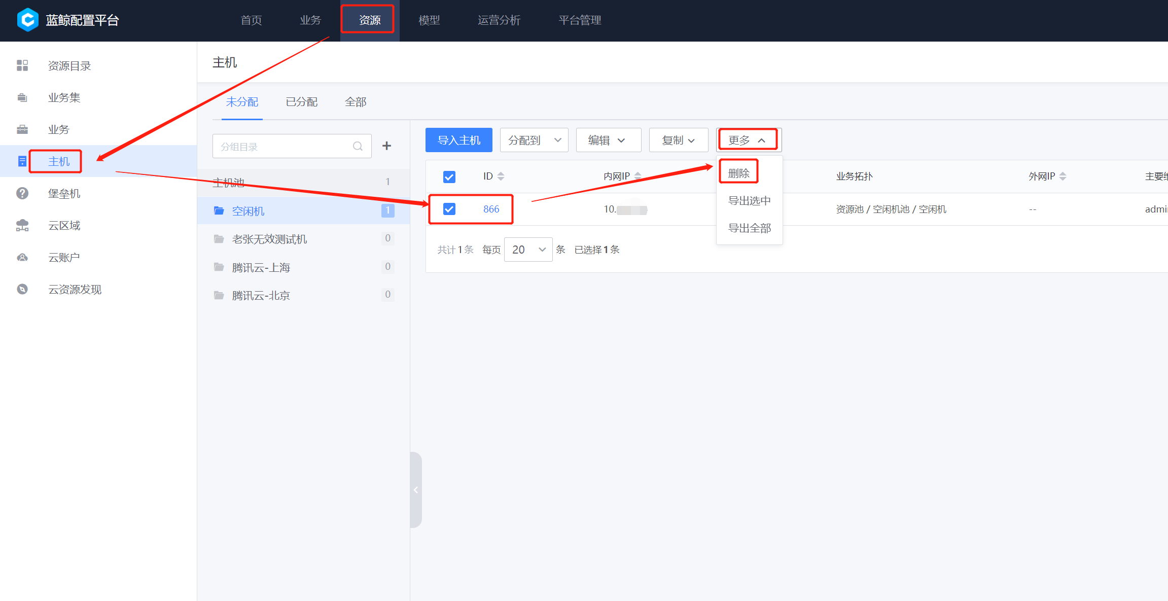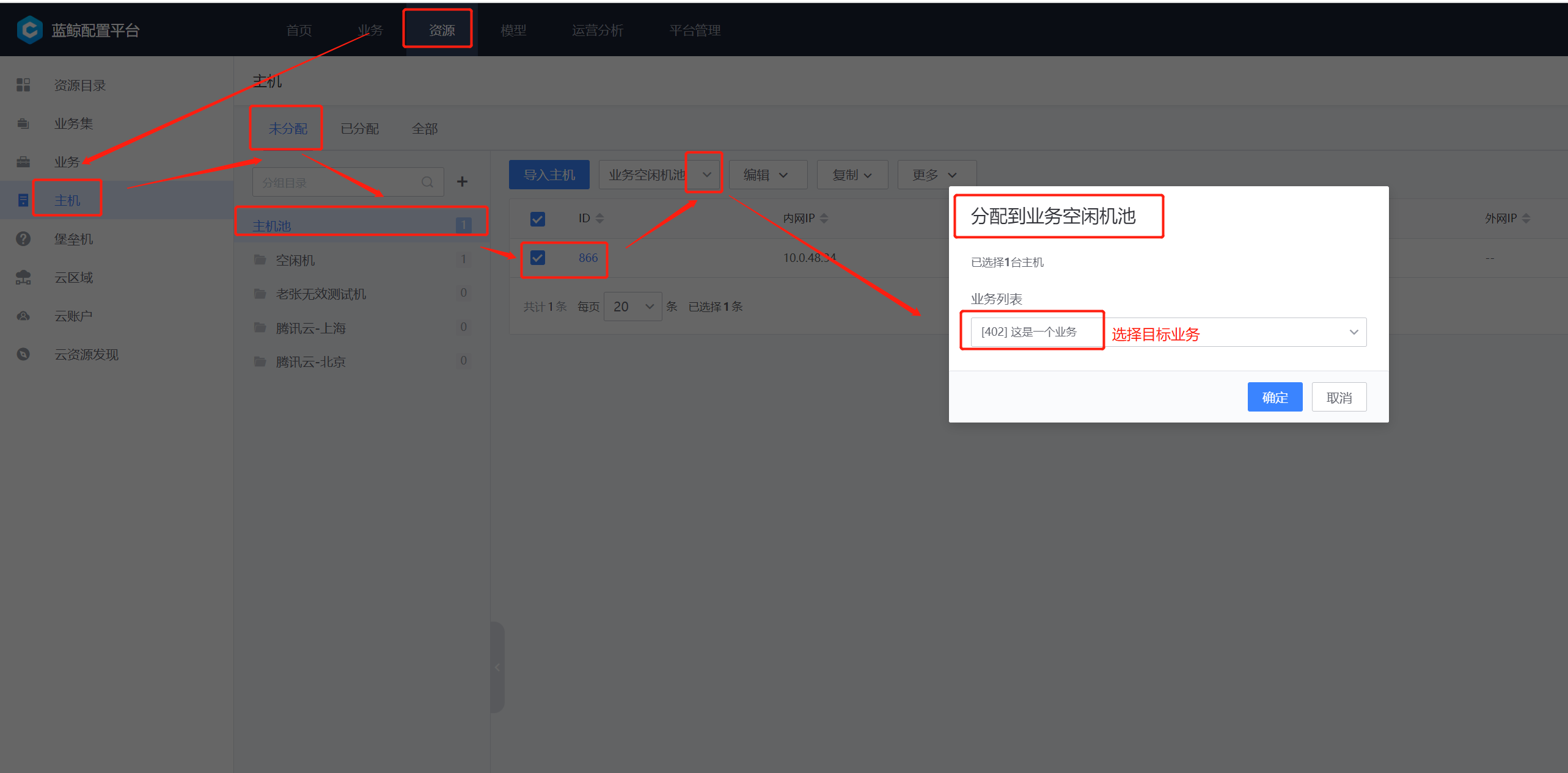 资源–>主机–>未分配–>主机池–>空闲机–>分配到–>选择目标业务