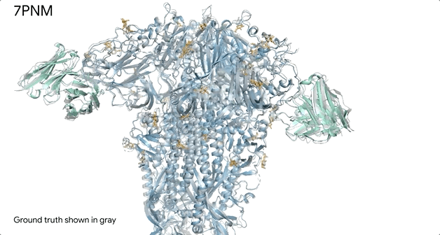 现在,AlphaFold 3对普通感冒病毒Spike蛋白(蓝色)的结构预测,灰色部分为预测结果。这能让人类更进一步了解冠状病毒。