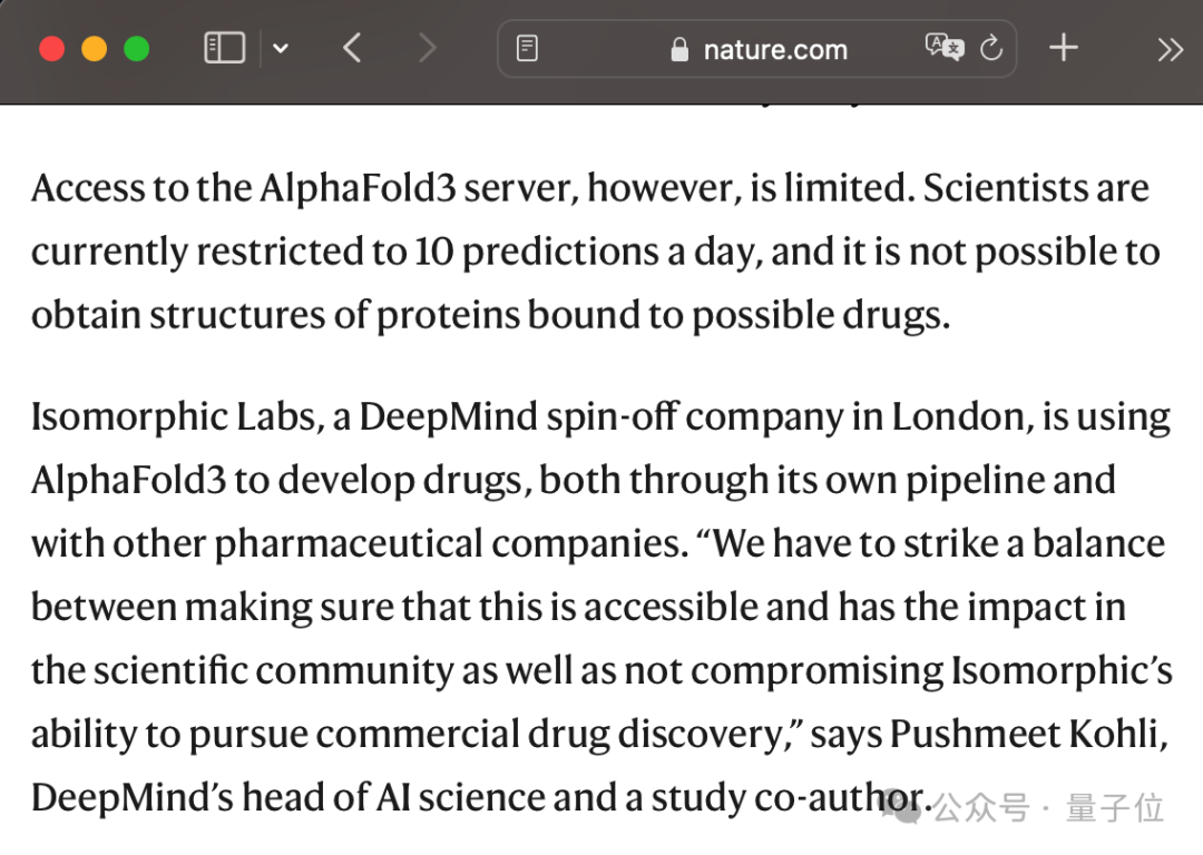 然而Nature报道指出,科学家对AlphaFold 3服务器的访问是有限的。目前每天只能进行10次预测,而且不可能获得可能与药物结合的蛋白质结构。