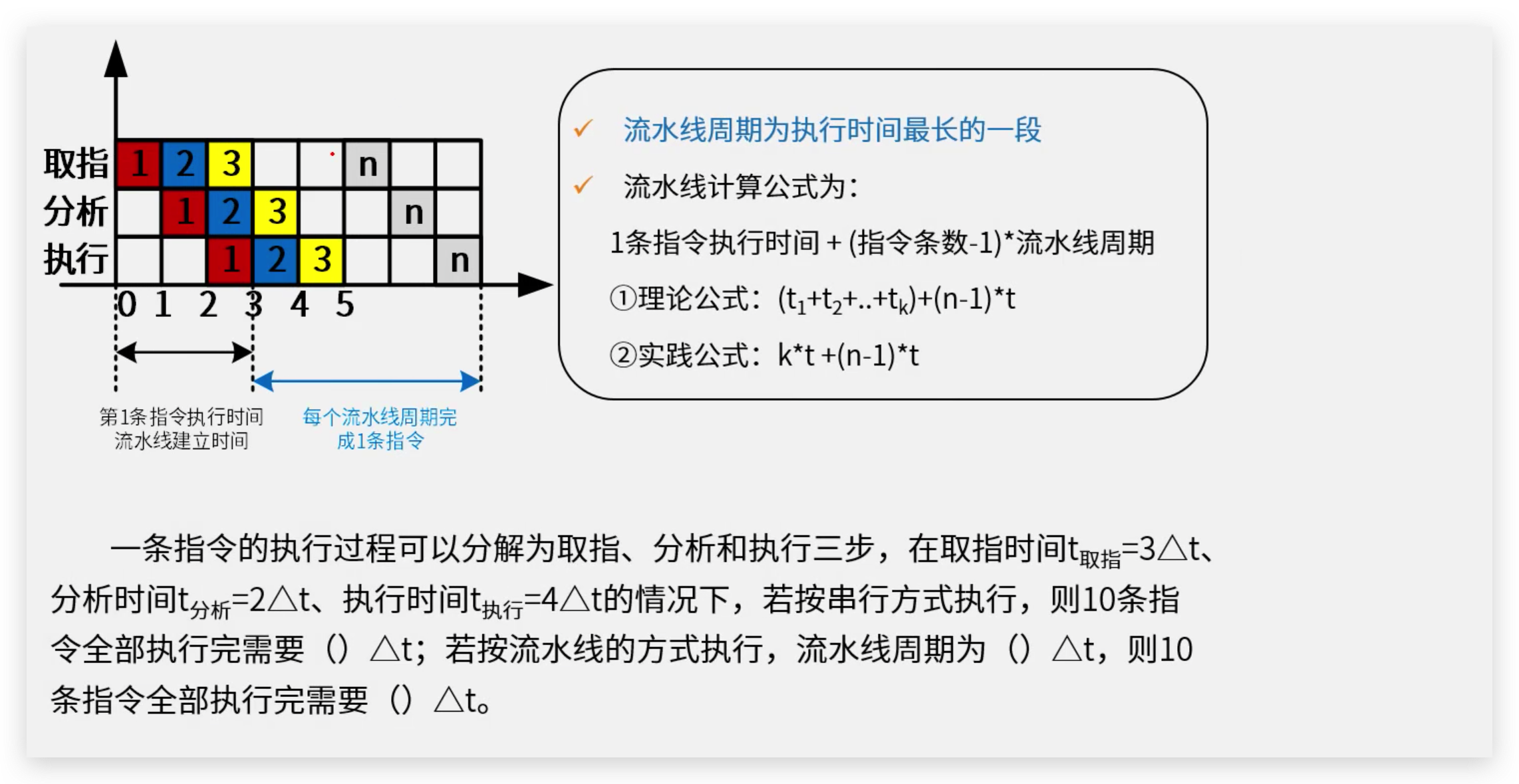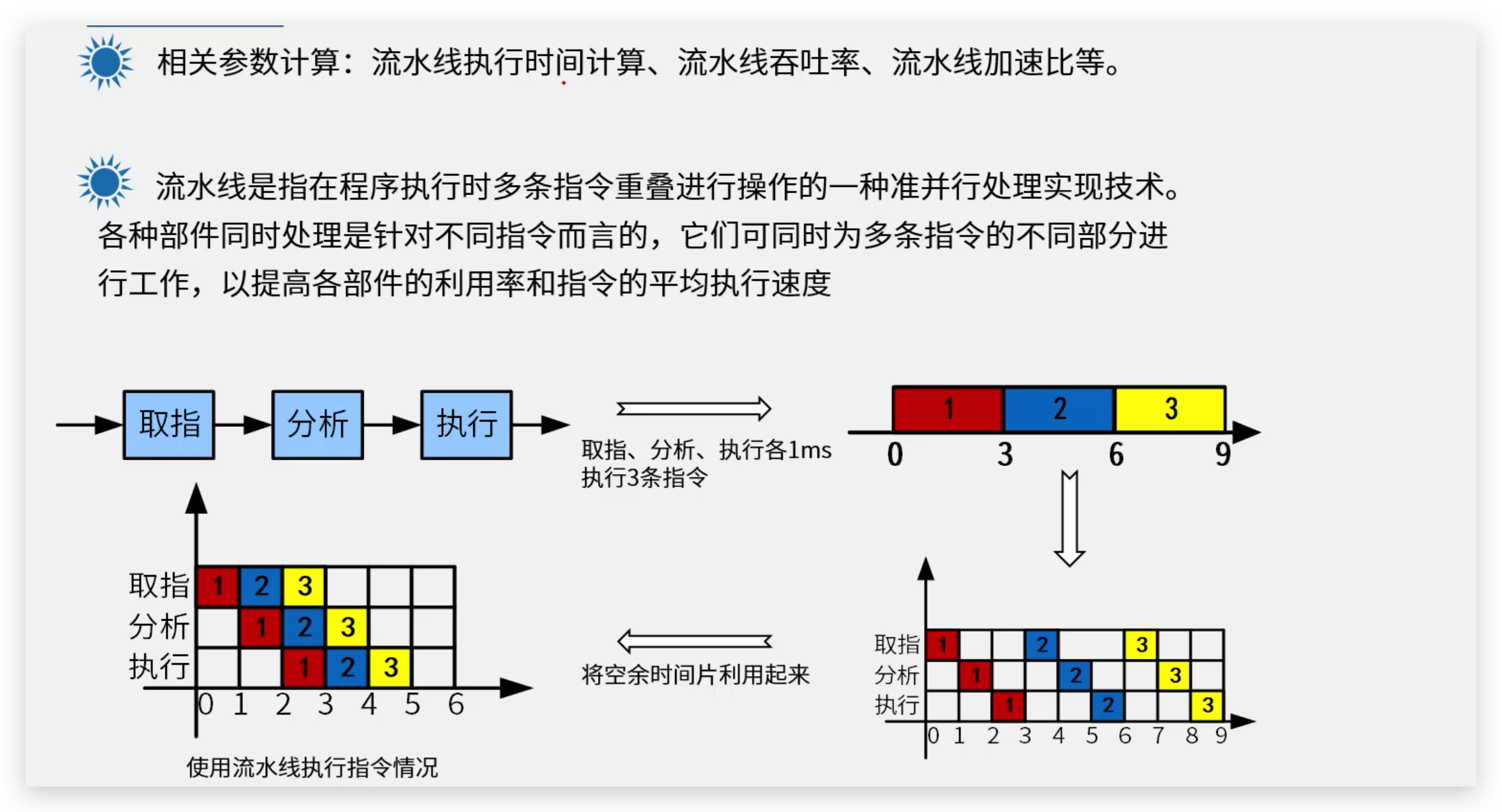 执行时间是衡量流水线性能的重要参数之一,它取决于指令数、每条指令的平均执行周期数(CPI)和时钟周期时间。流水线的执行时间计算考虑了流水线的所有阶段。