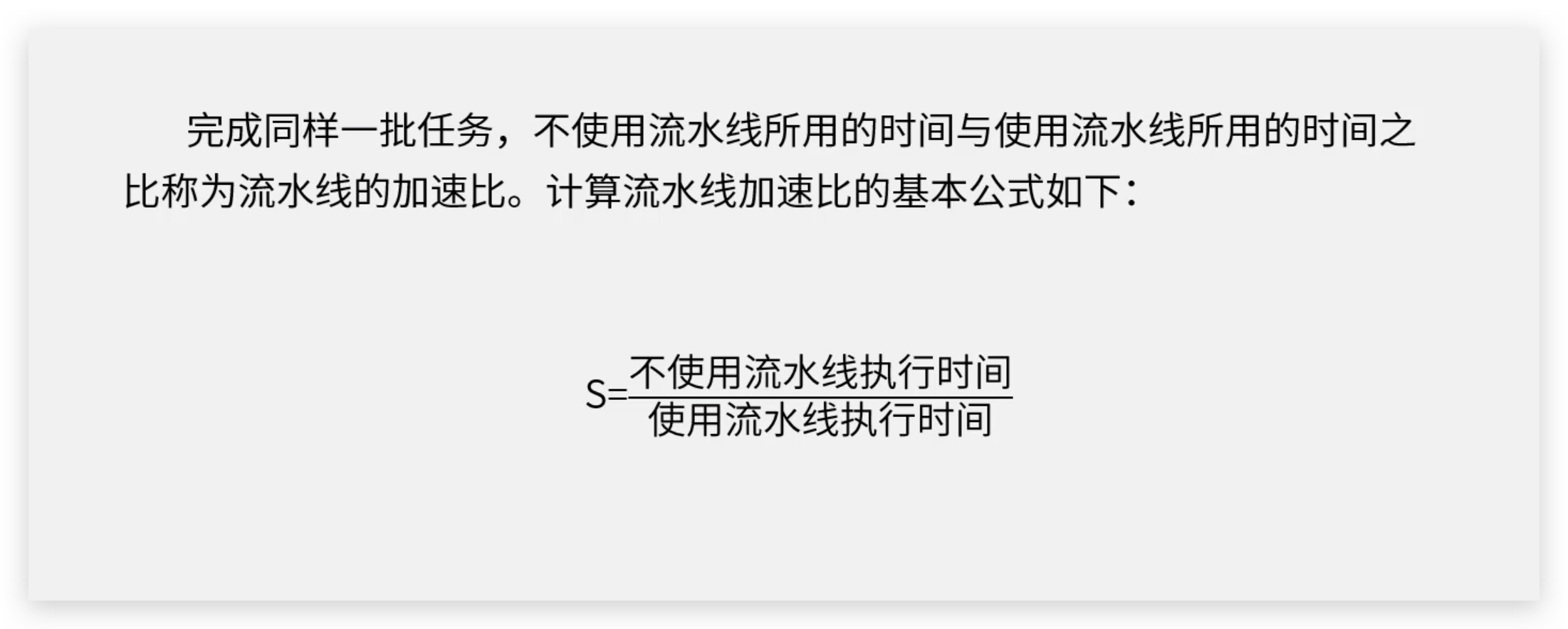 | 引入流水线技术后系统性能的提升比例,计算公式为加速比=优化前系统的执行时间 / 优化后系统的执行时间。 |