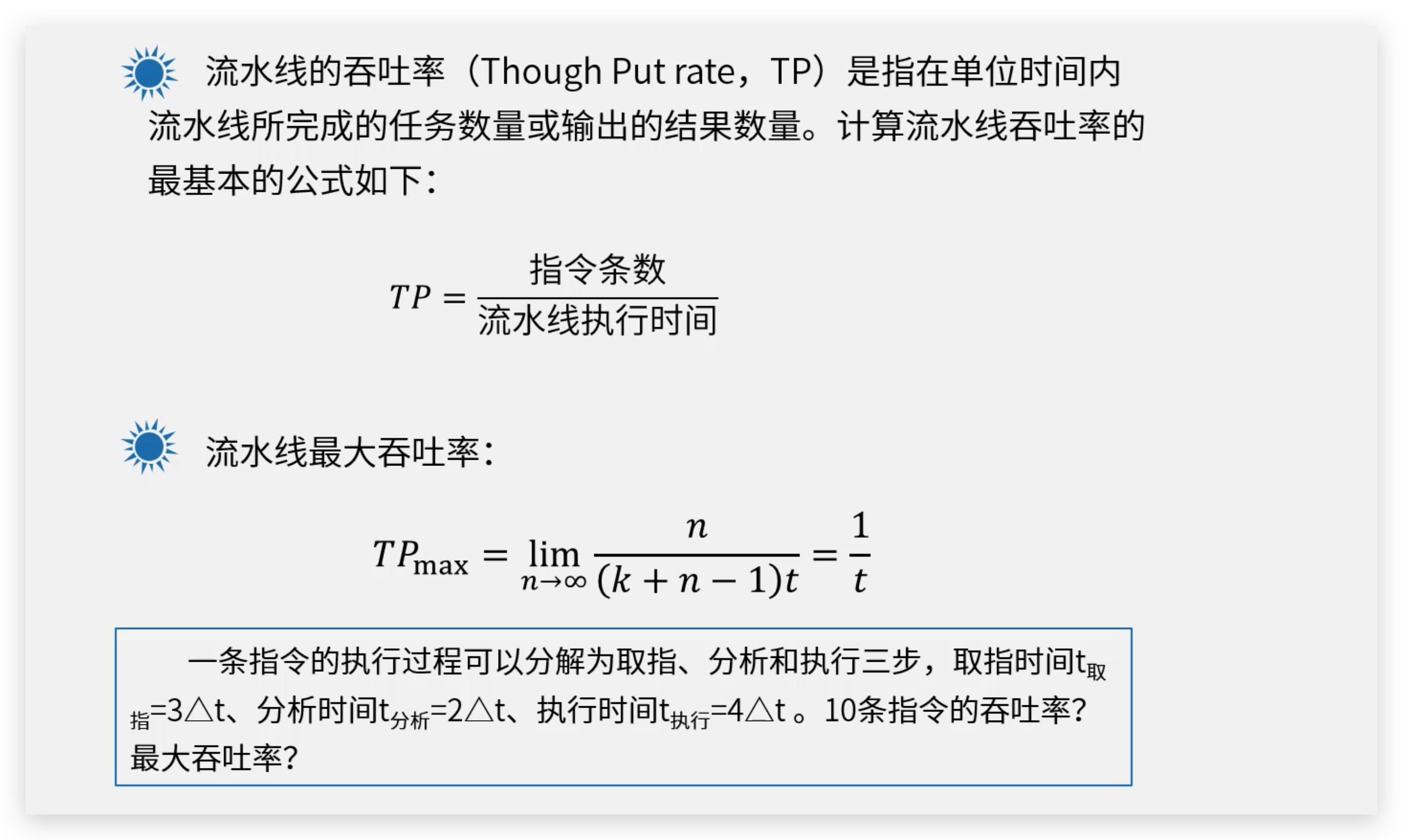 | 单位时间内流水线完成任务的数量,通常以每秒完成的任务数来衡量。 |