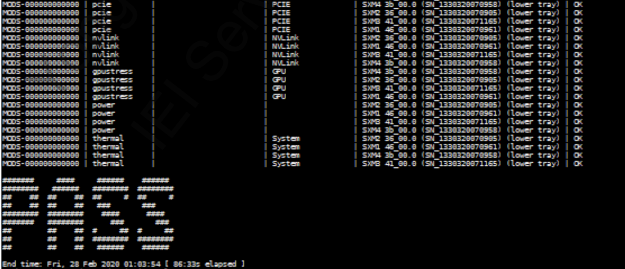 最终有三种结果:PASS FAIL RETEST。如图,pass即压测通过,GPU&链路正常,fail则可以通过日志观察到是哪颗GPU的哪一项压测未通过并及时更换,因异常设置导致无法开始压测时会显示retest。