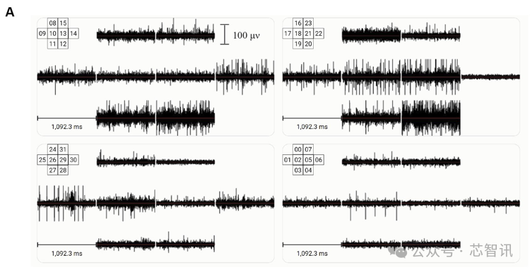 △以 μV 为单位测量 32 个电极中每个电极一秒钟的电活动,每组 8 个电极记录不同的类脑组装