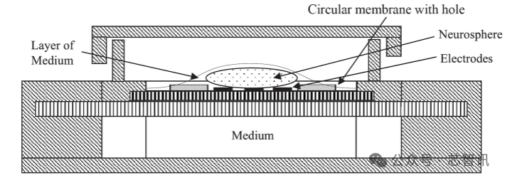 据介绍,MEA 装置采用空气-液体界面 (ALI) 方法,其中将类脑器官直接放置在位于通透膜上方的电极上,培养基在 170 μL 腔室中在该膜下方流动。由表面张力形成的一层薄薄的培养基将类器官的上侧与加湿的培养箱空气隔开。部分覆盖 MEA 的盖子进一步保护了这种布置(如下图)。与浸没式培养的方法相比,这种 ALI 方法可实现更高的通量和更高的稳定性,因为不需要专门的涂层,并且类脑器官也不太容易从电极上脱落。